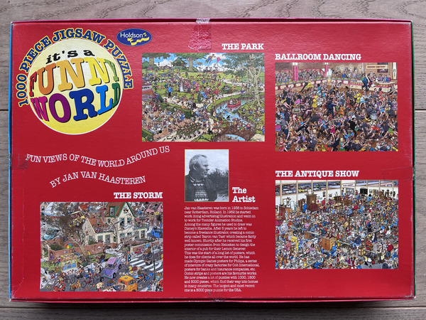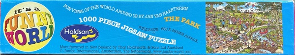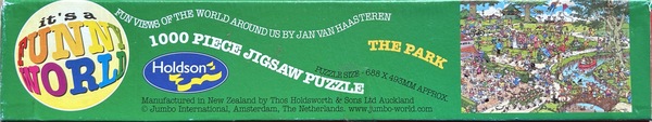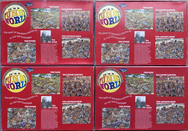 | Beskrivelse | Dette puslespil er en del af et sæt på fire puslespil udgivet af den newzealandske puslespilproducent Holdson Funny World (HFW)Dette puslespil har nummer 08745, ligesom tre andre puslespil i dette sæt. For mere information om hele sættet, besøg venligst "Holdson Funny World puslespil 08900Dette puslespil er sjældent, fordi de alle blev udgivet i New Zealand. Det er også mere et samlerobjekt, da alle pladerne/tegningerne fra disse puslespil også blev udgivet i en Jumbo-version i Holland. Der er et sæt ældre puslespil udgivet af Holdson Funny World - og disse æsker ser alle anderledes ud end de nuværende, genkendelige blå Jumbo-puslespilæsker. Mange af disse æsker har flere klare farver. I alt 48 af disse ældre puslespil blev udgivet af Holdson Funny World (HFW), og disse er derfor de sjældnere. Du ser næsten aldrig disse puslespil på markedspladser som Marktplaats. Du skal virkelig kigge på brugte puslespilshandelsplatforme i nærheden af New Zealand og Australien. Ulempen: Hvis du vil købe et, skal du betale en masse importafgifter, og puslespillet tager ofte lang tid om at ankomme. Den dag i dag udgives Jan van Haasteren-puslespil stadig i den velkendte blå puslespilsæske. Disse puslespil i de velkendte blå æsker er IKKE sjældne; du kan nemt bestille dem fra en onlinebutik i New Zealand. Dette puslespil, "The Park", nummereret 08900, er sjældent. Designet er det dog ikke, da "The Park" også er blevet udgivet af andre mærker, såsom Jumbo. Udgivelsen af HFW gør det sjældent og ofte et samlerobjekt. Det leveres i en smuk, farverig æske med disse fire farver på de fire sider: blå, grøn, rød og pink. På bagsiden af æsken kan du se, hvilke fire puslespil der tilhører "sættet" nummereret 08900. En ekstra bonus er, at puslespillet... Antikudstillingen Et klistermærke var påsat med følgende tekst: "70-års jubilæumskampagne. Saml 3 værdikuponer og få 1 gratis puslespil med 1000 brikker. Kampagnen udløber den 31. januar 2010. Se indersiden af æsken for yderligere information." Så puslespilserien med nummer 08900 må have været fra 2009, da HFW fejrede sit 70-års jubilæum i 2009. |